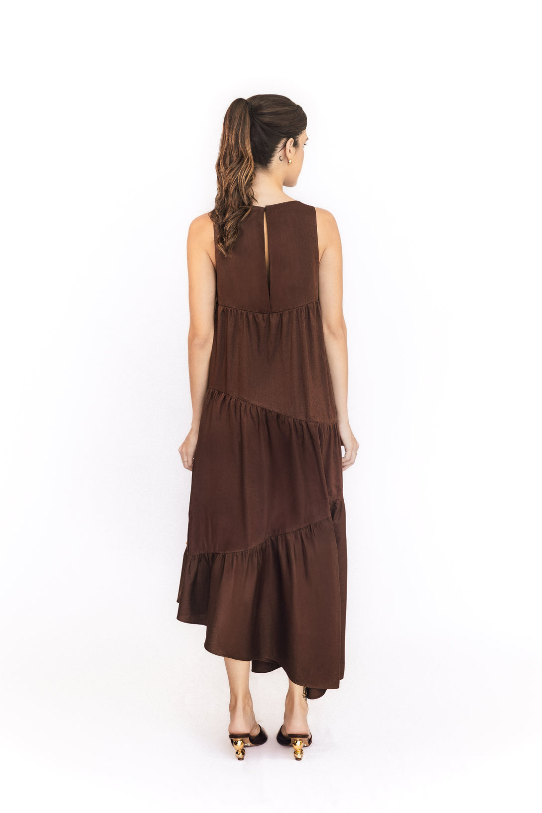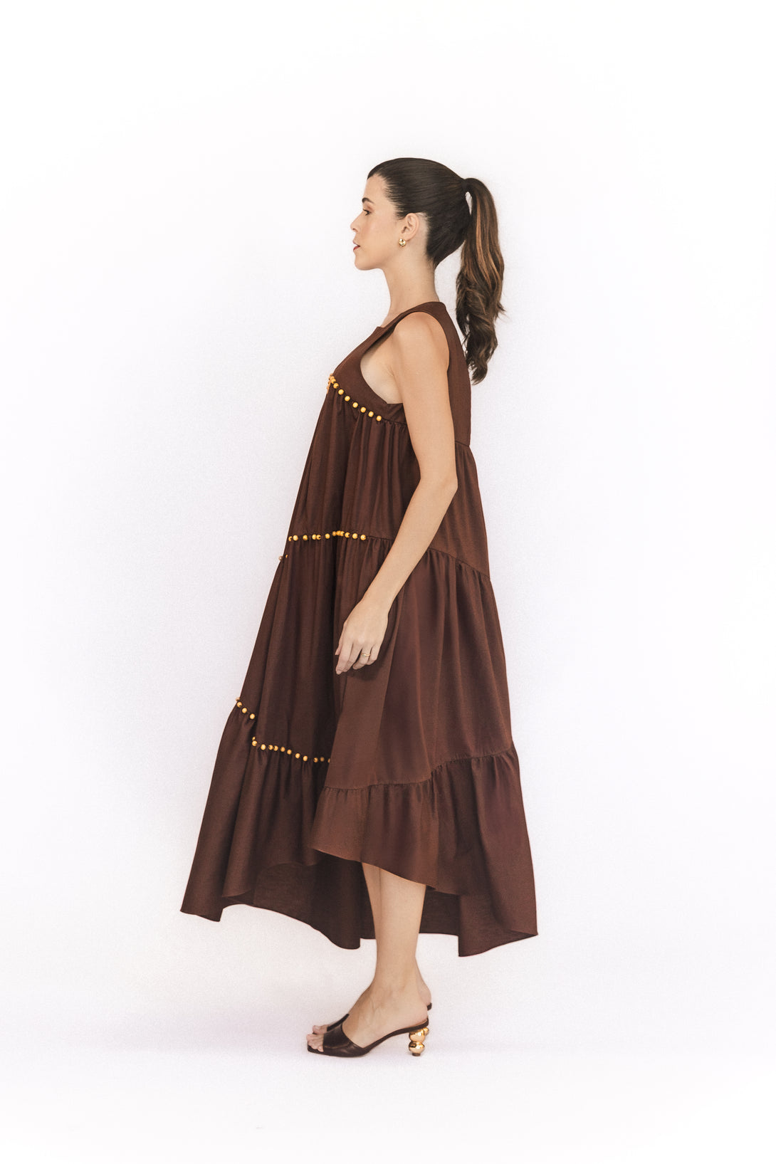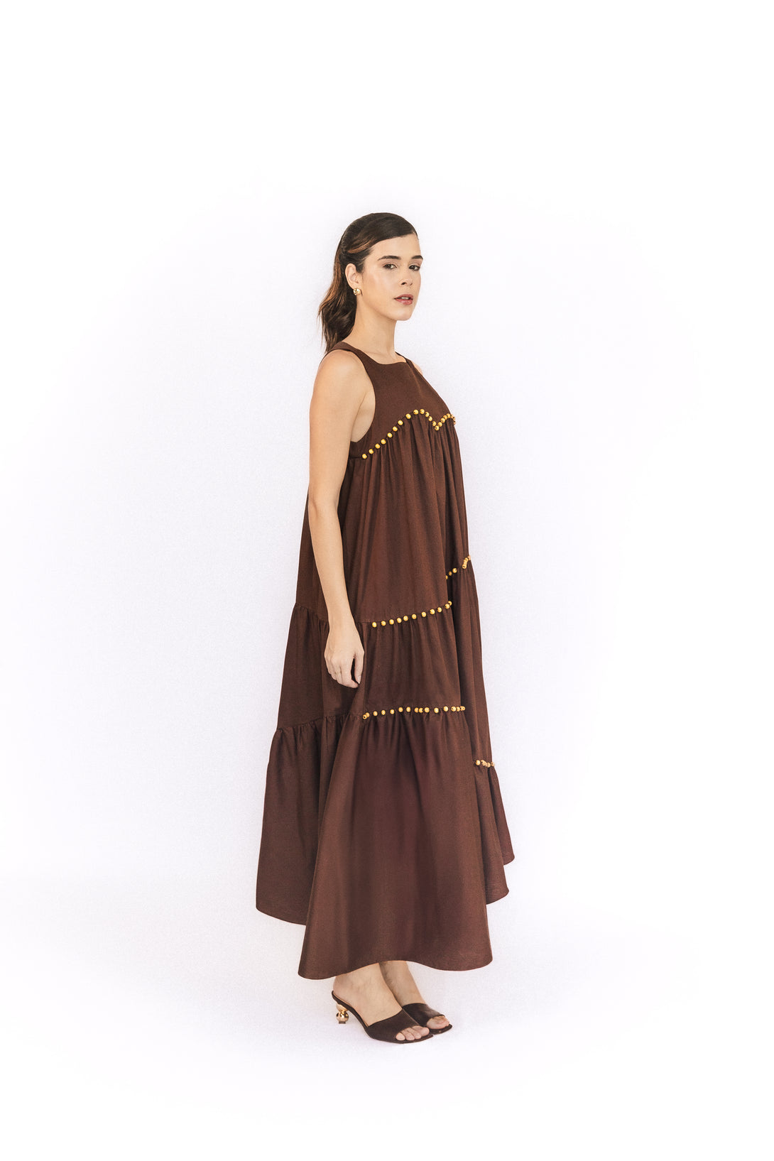 A barra assimétrica traz leveza inesperada, enquanto o bordado artesanal com miçangas de madeira revela o cuidado único de cada detalhe.